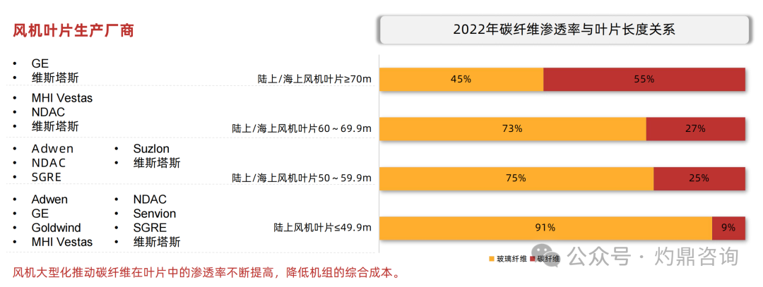 风机大型化是未来的发展趋势,叶片重量随着长度增加呈几何级数增长,使得风机载荷增大、风机部件成本增加。在满足刚度和强度的前提下,采用碳纤维的风轮叶片比玻璃钢叶片质量轻30%以上,即使碳纤维叶片的成本上升,但带来的传动链上相关部件以及塔筒的优化减重使得风电机组的整体成本降低10%以上。
