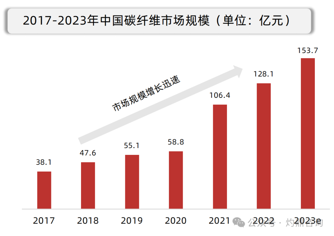 碳纤维行业是国家战略新兴产业,具有广阔的发展前景。近年在风电叶片、体育用品等领域得到广泛应用,市场规模一直保持增长趋势。2017年至2022年间年均复合增长率高达27.4%。中国碳纤维产量也持续扩大,从2019年的1.2万吨扩大至2023年的6.96万吨,年均复合增长率高达55.2%。