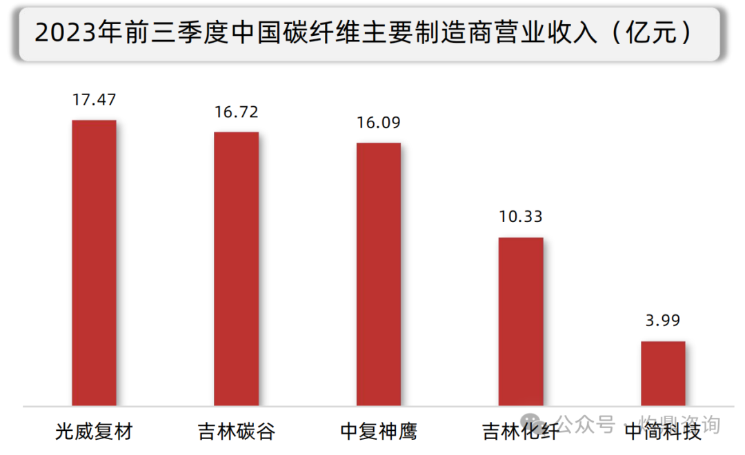 中国碳纤维市场呈现出高集中度的特点。根据2023年前三季度中国碳纤维主要制造商的营业收入数据,光威复材、吉林碳谷和中复神鹰等龙头企业占据了显著的市场份额,主导着市场的发展。