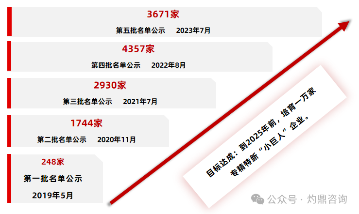 根据我国陆续公布的五批专精特新“小巨人”企业名单,截至2023年7月,我国已累计公示12950家企业。第一批公示企业248家,实际复核通过155家;第二批公示企业1744家,实际复核通过1584家;第三批公示企业2930家,实际复核通过2930家;第四批公示企业4357家,实际复核通过4328家;第五批公式企业3671家;实际复核通过1079家。