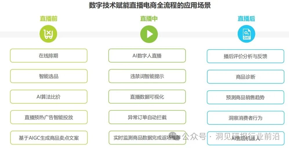 数字技术深度赋能直播电商行业发展的前期阶段,主要向招商选品环节渗透,伴随行业数字化转型加速,直播电商全流程各环节均开始融入数字技术以解决业务流程管理难度较高与各环节协同效率较低的问题。