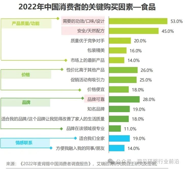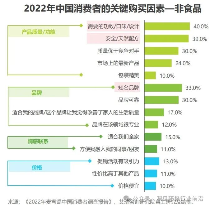 从一级维度看,消费者在购买商品时会根据“产品质量/功能、品牌、情感联系及价格”等多个维度形成决策且消费者对于不同品类所考虑的一级维度会存在优先度差异。从二级维度看,消费者的考虑因素在不同品类下同样存在优先度差异,如在“品牌”维度下,消费者购买非食品的商品更加看重品牌的知名度,而购买食品时更加看重品牌的可靠度。