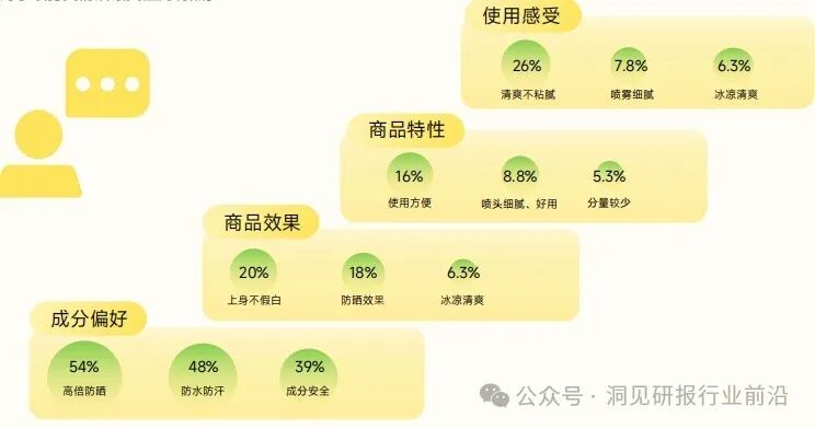 高倍防晒、防水防汗、成分安全,是消费者购买防晒喷雾时首要考虑的因素,而这些特点也适用于所有防晒产品。而清爽、喷雾细腻、使用方便是消费者对于喷雾类防晒最关注的特点。