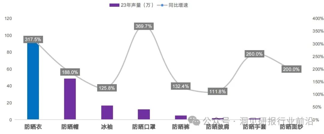 服饰类防晒产品包括防晒衣、防晒帽、防晒口罩等为消费者身体部位提供保护的产品。从社媒声量规模和同比增速来看,防晒衣仍是最为核心的品类。