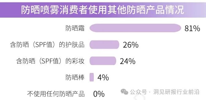 同时,81%的人群还会使用防晒霜,此外,部分消费者也会搭配其它具有防晒功效产品,防晒心智已经有了一定程度上的普及。