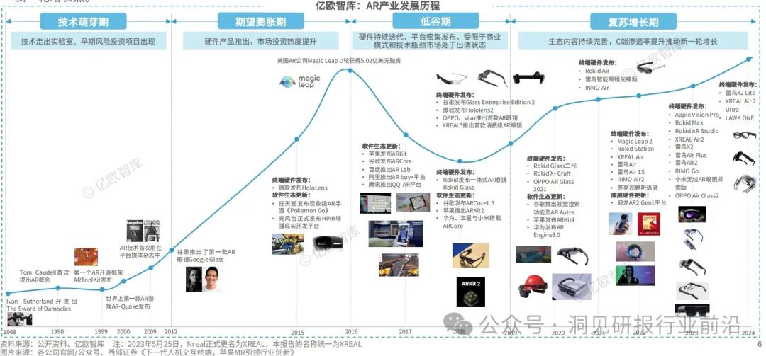 自AR技术诞生以来,历经技术萌芽期、期望膨胀期和低谷期,5G、疫情、数字孪生、元宇宙、人工智能等诸多因素叠加使得AR产业逐渐复苏走向高速增长期,市场规模稳步提升,细分行业渗透率持续提高。