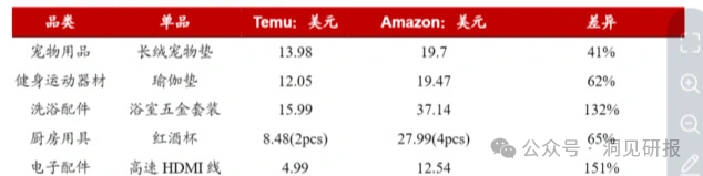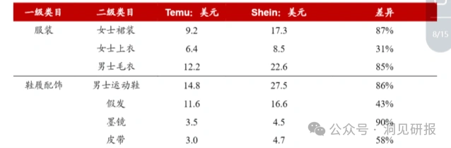 浙商证券抽样统计数据显示,在服装鞋履方面,Temu抽样单品价格低于Shein30%以上;在家居百货方面,Temu部分标品配件价格甚至低于亚马逊一半以上。