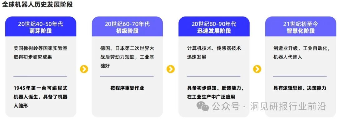 全球机器人行业的发展经历了萌芽阶段(20世纪40-50年代)、初级阶段(20世纪60-70年代)、迅速发展阶段(20世纪80-90年代)、智慧化阶段(21世纪初-至今)等四个阶段。