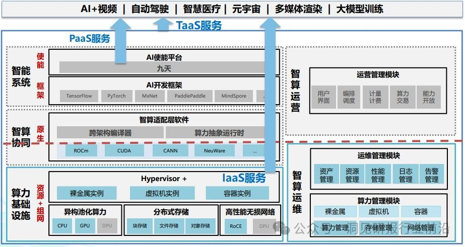 中国移动智算中心基于移动云底座的Iaas能力,管理算力基础设施层的各类硬件资源,向上提供智算类业务所需任务式服务,构建一体化的 AI新型智算体系。