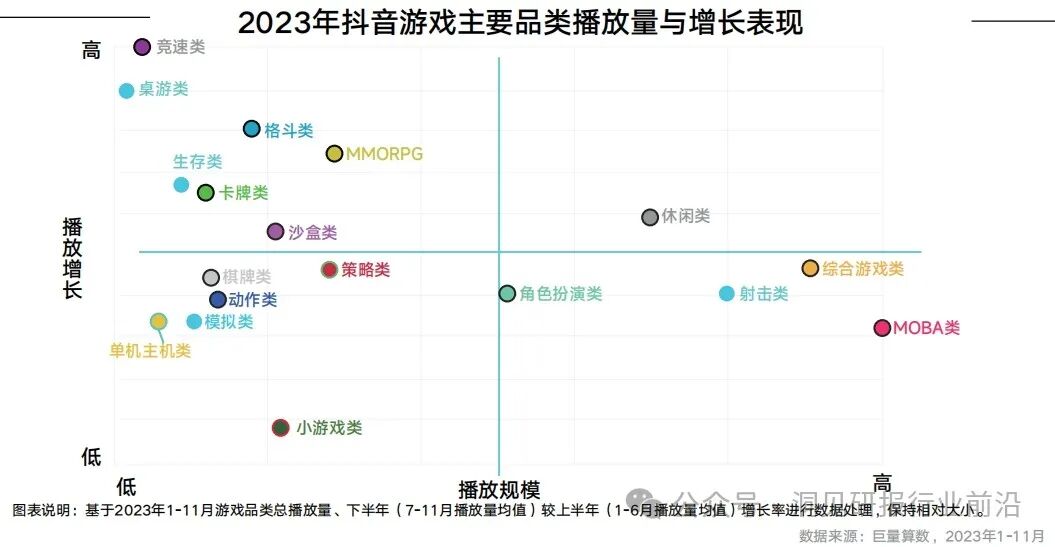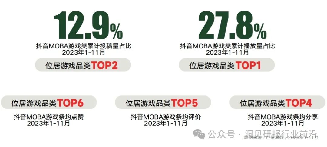 热门游戏视频覆盖多元品类,MOBA游戏最受欢迎:抖音平台涵盖各大游戏品类内容,且各类游戏均能在平台实现破圈。2023年,抖音播放量TOP1000的游戏视频覆盖19大品类,播放量差异显著。