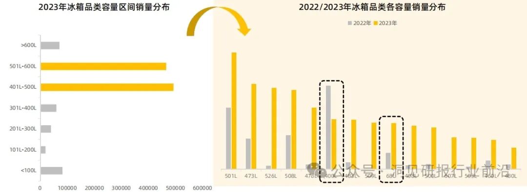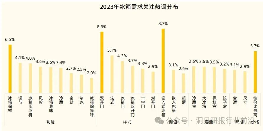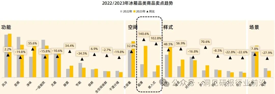 2023年,风冷、大容量仍是品牌上架商品的主要卖点,超薄、嵌入式的卖点同比增长明显,基于消费者对于更为美观、节省空间的冰箱设计有需求,品牌通过强调这些特点来吸引消费者,同时,在商品相关功能卖点中除了无霜、保鲜外,净味、除菌也成为了品牌上架商品的主要卖点之一。