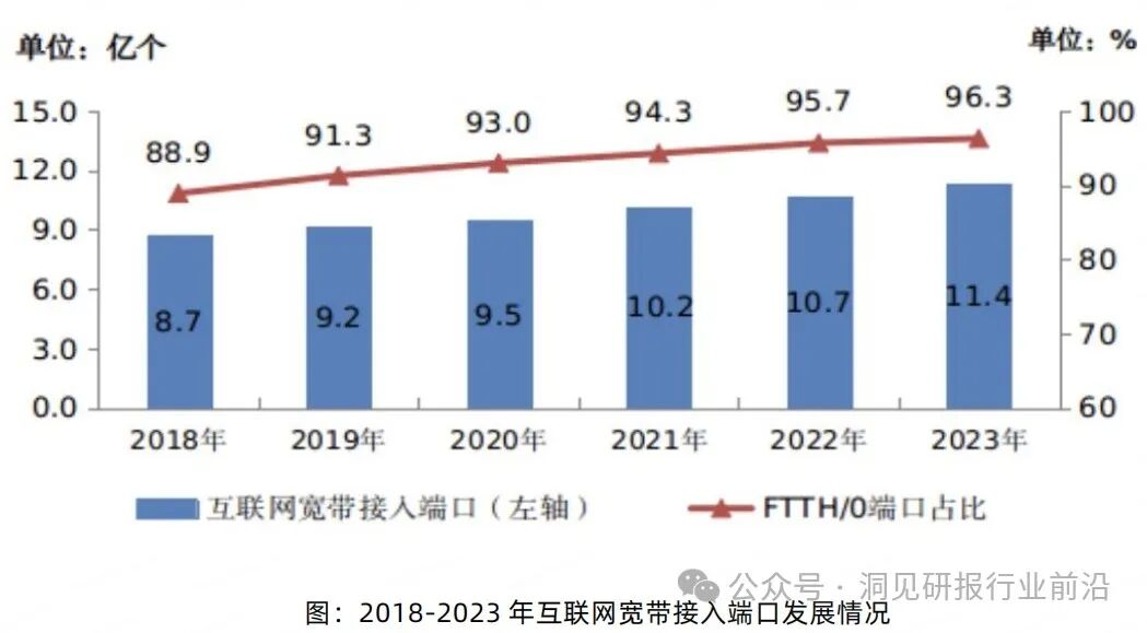 全光网建设快速推进。2023年,新建光缆线路长度473.8万公里,全国光缆线路总长度达6432万公里;其中,长途光缆线路、本地网中继光缆线路和接入网光缆线路长度分别达114万、2310万和4008万公里。截至2023年底,互联网宽带接入端口数达到11.36亿个,比上年末净增6486万个。