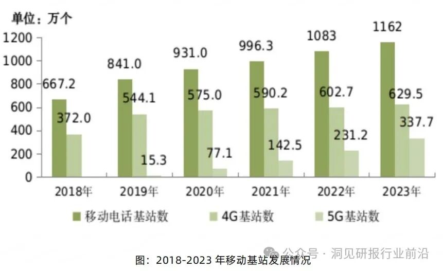 2020年,我国5G已开始规模化商用,5G网络建设开始进入上升趋势。截至2023年底,全国移动通信基站总数达1162万个,其中5G基站为337.7万个,占移动基站总数的29.1%,占比较上年末提升7.8个百分点。