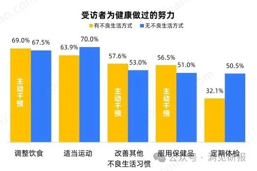 尽管有不良生活方式已成多数人常态,但他们也意识到健康生活的重要性,会倾向于主动干预和调整自己的健康生活方式。主要的干预方式包括调整饮食 (69.0%) 、改善其他不良生活习惯 (57.6%)以及服用保健品(56.5%)。