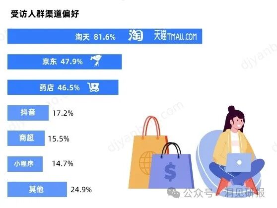 随着社会经济变化,消费者的购买场景及方式也在发生着改变,对于购买保健品的消费者们,购买渠道以传统电商为主,其中淘天平台选择占比最高,高达81.6%。淘天平台能够提供国内海外各类型的保健品,如天猫国际可支持消费者选择各种国际品牌。其次是京东平台,选择占比为47.9%。线下药店(46.5%)也是消费者购买保健品的主要渠道之一。