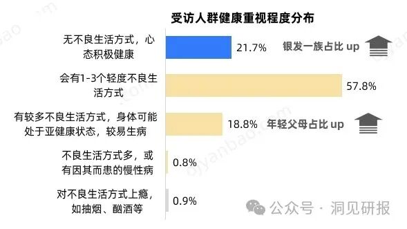 再从受访人群健康重视程度调查显示,有21.7%的人表示他们拥有“无不良生活方式,心积极健康”的生活方式,其中银发一族的此选项占比相对较高,也标明老年人更加注重健康生活习惯的保持。然而仍有57.8%的人存在1-3个轻度的不良生活方式,18.8%的人存在较多不良生活方式且处于亚健康状态,其中,年轻父母的占比较高!