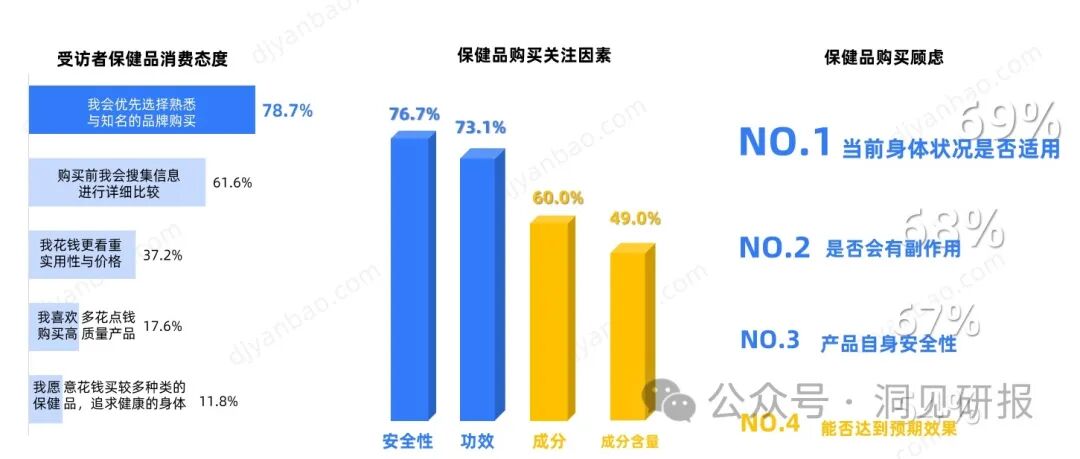 在本次调研中,洞见研报也发现受访人群购买保健品时普遍会优先选择熟悉的知名品牌。而产品力则是大众广泛关注的关键因素,如安全性、功效、成分及其含量。