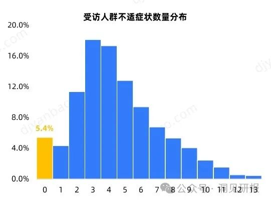 洞见研报在本次调研中发现,没有不适症状的受访者占比不足6%,其余受访者或多或少都存在身体不适的症状,其中3-4个症状居多,亚健康已经成为普遍现象。