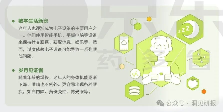 -老年群体,随着年纪增长,眼部机能逐渐老化,营养流失加剧,眼部疲劳、干涩、红痒等不适加重,更易受到眼部疾病的侵袭。