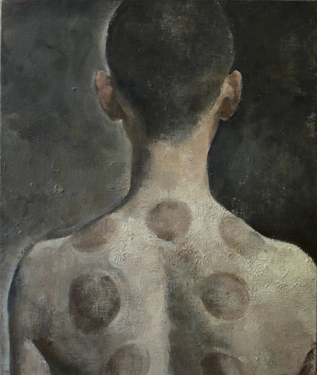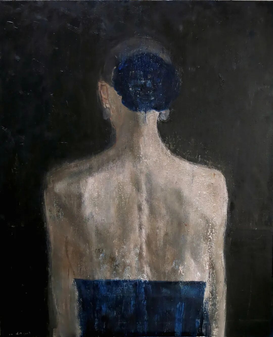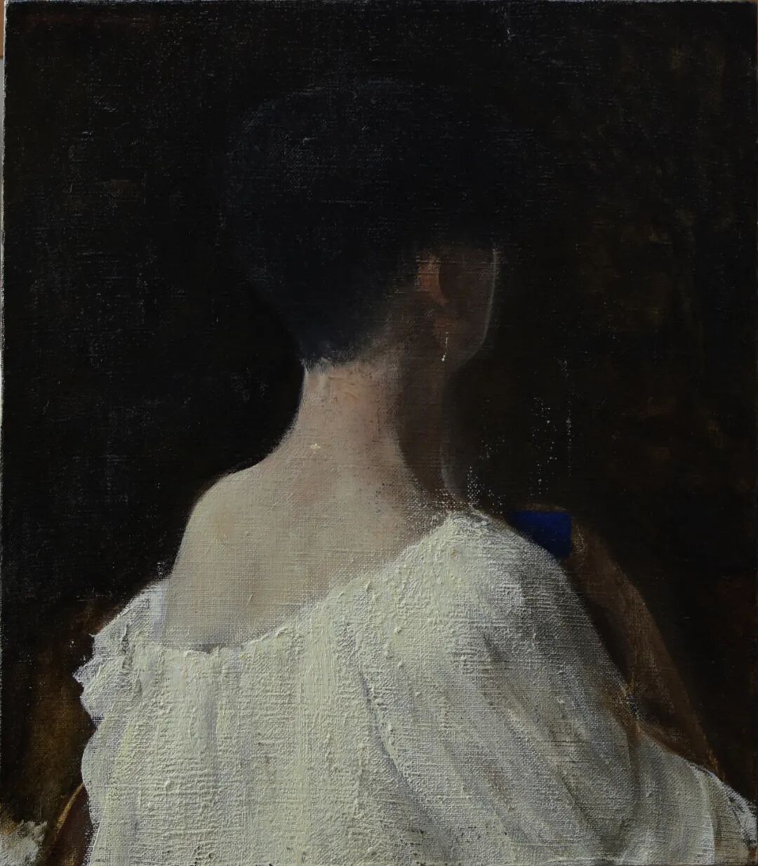 在《呼吸者-白色物7》作品中,从作品名称上看,“呼吸者”是每一个活着的人,也是存在过的人,是一种对人的思考;从绘画题材上看,艺术家转换观看人物的视角,选择被人极易忽视的角度——后背,人的面部虽然迷人生动,但同时也是极具诱导性与欺骗性,艺术家抛弃了正面肖像所独有的表情与神态,不指向个人的神貌与性格,强化所观察到人的共性世界,以较为纯粹的方式暗示出不同人群之中隐藏着的精神素质;从绘画语言上看,笔触和刮刀在画布表面反复涂抹,深沉般的色彩调度来回闪跃,粗砺肌理的细部以及松弛的轮廓相应交织;其次,表面上背景描绘了隐喻上的黑,整体氛围给人以不安与伤感,艺术家似乎是在表现一种被困抑的矛盾或是一种未明示的疾苦。
