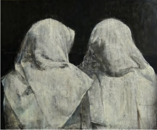 在作品《头颅上的白色2》中,艺术家将现实生活中的人物形象带入画中,通过画中的人物肖像展现一群人的故事,她在向内寻求作品精神的意义中,扮演了捕捉者的作用。作品中的通过面孔传达信息,每一个人,面对不断显现的问题,他们有着直面世界的勇气,也传递出作者真实的感受。艺术家通过绘画的方式紧紧捕捉精神的质感,她在作品中显露出一些克制、示喻、感伤的气息,她的画沉默、严苛、有力,简练却意味深长,在力量感与自我克制之间达到了完美的平衡,让观者在欣赏形式之外留有更多的遐想空间,从而让释读都来自于观者隐性的内心。