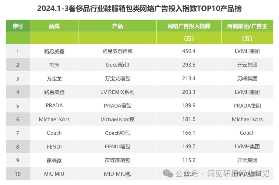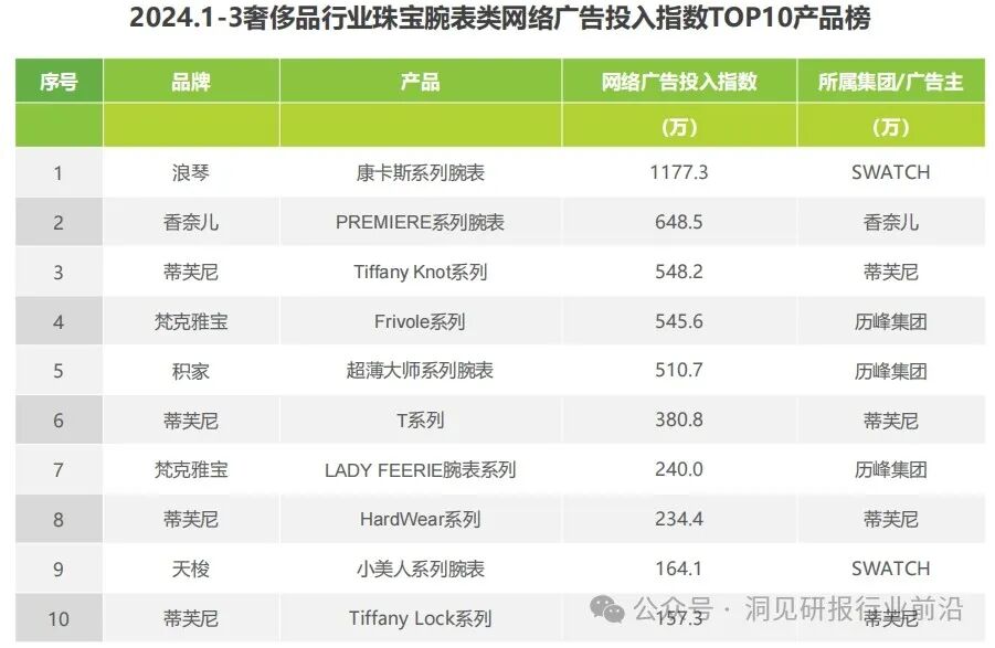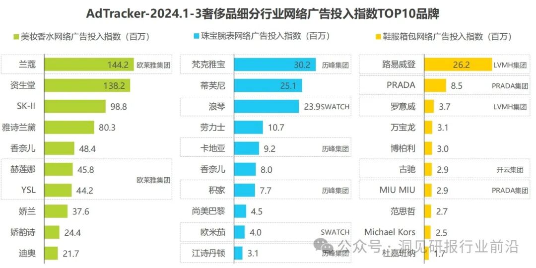 在奢侈品三大细分行业的网络广告投入指数TOP10品牌中,美妆香水品类欧莱雅集团旗下品牌表现突出,占据榜单3席;珠宝腕表品类方面,历峰集团和SWATCH集团的品牌分别占据了TOP10中的4席和2席;而在鞋服箱包品类广告投放TOP10品牌中,各品牌所属集团则相对分散,值得注意的是,路易威登2024年1-3月的投入指数大幅领先于其他品牌,达2620万。