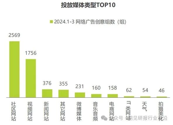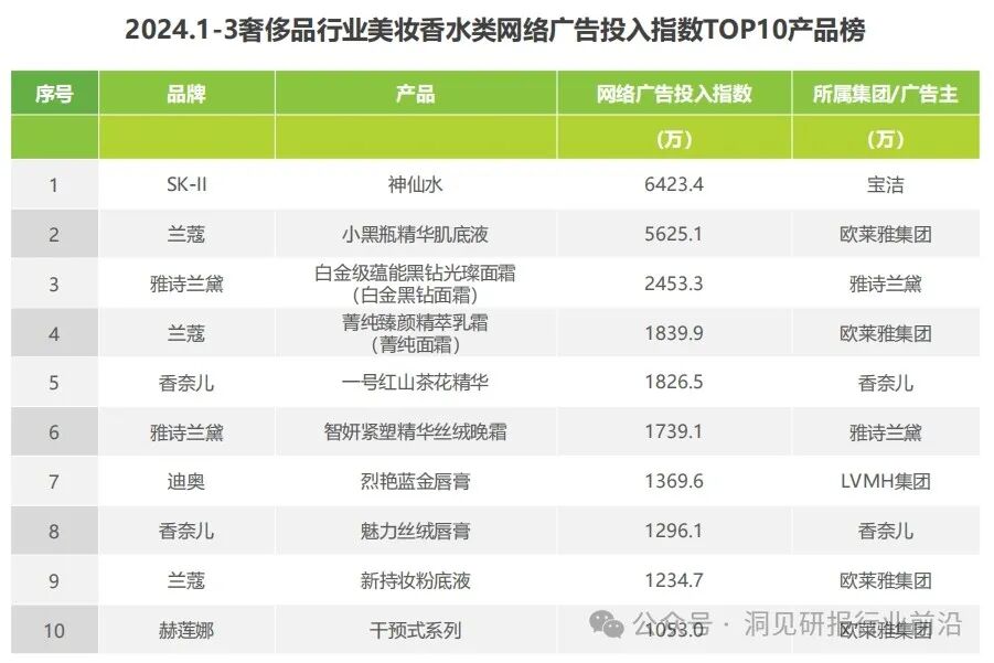 2024年1-3月期间,奢侈品行业的网络广告投入指数达9.9亿,环比上一季度增长超两成;在此之中,美妆香水类奢侈品投入指数达7.2亿,投放占比为72.5%,成为行业内广告投放的主要品类。