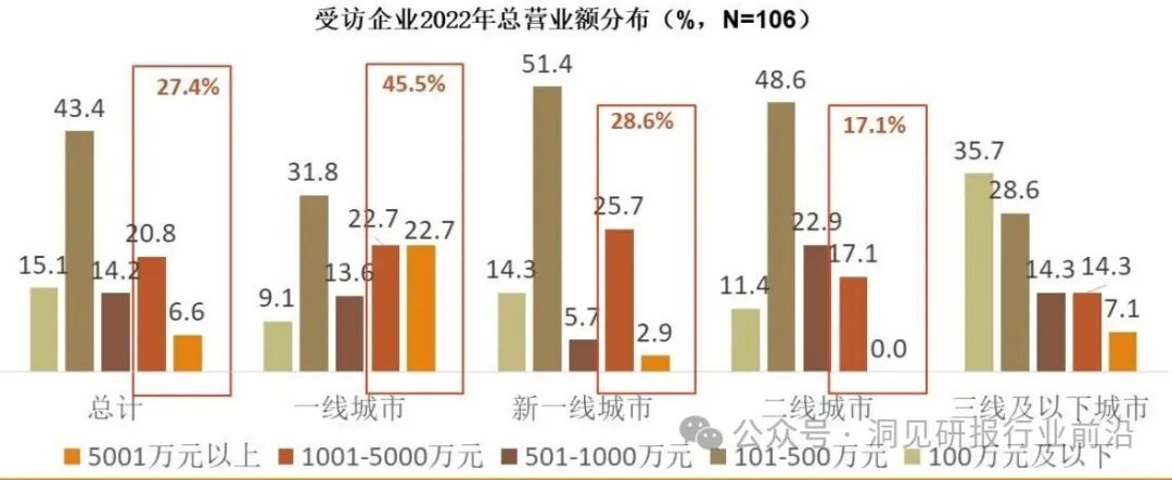 总体来看,近三分之一的企业(27.4%)2022年项目总额度在千万以上。一线城市中,千万以上的企业占比为45.5%:新一线城市中,千万以上的企业占比28.6%:二线城市是17.1%。除三四线城市外,本次受访企业城市级别越高,总额度在千万以上的占比越高。