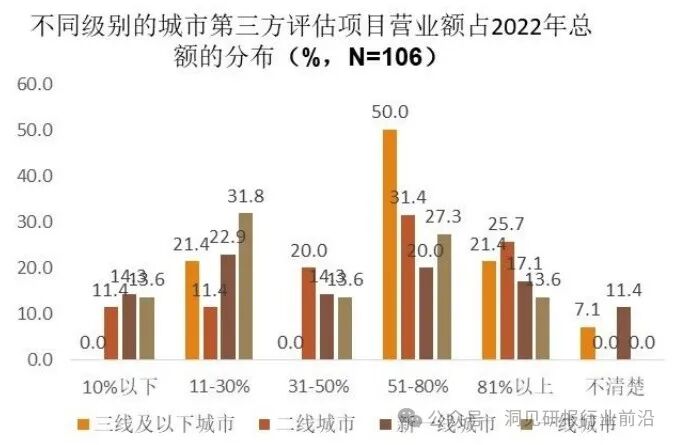 2022年第三方评估项目营业额占比50%以上的受访企业有49.1%(比2021年12%提升了37.1%),其次占比在11-30%的有20.8%,占比在31-50%的是14.2%。从不同城市级别来看,第三方评估项目额度占比51-80%最高的是三线及以下城市。