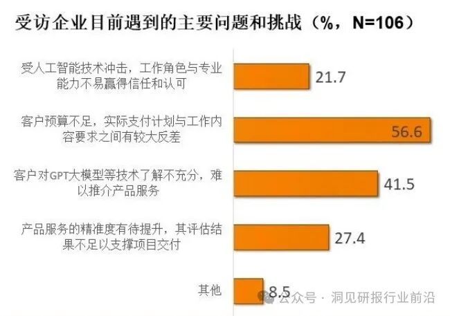 受访企业当前遇到的主要两大问题和挑战是“客户预算不足,实际支付计划与工作内容要求之间有较大反差”(56.6%)和“客户对GPT大模型等技术了解不充分,难以推介产品服务” (41.5%)。