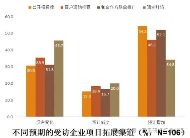 一线城市的受访企业更多采用公开招投标的方式(26.4%),新一线城市(42.9%)和二线城市(37.1%)的受访企业更多陌生拜访,三线及以下城市更多采用和合作方联合推广(18.8%)。认为营业额会增加的受访企业,采用的拓展渠道是多管齐下,其中公开招投标占到54.2%:认为营业额没有变化的受访企业,陌生拜访比例则最高(45.7%)。