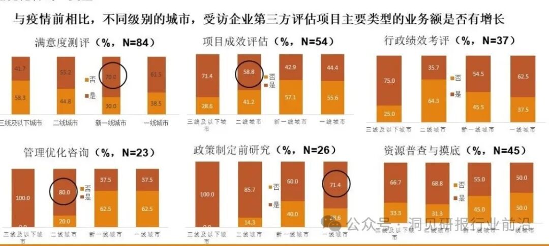从不同级别的城市来看,一线城市里增长最高的是“政策制定前研究”类型(71.4%):新一线城市增长最高的是“满意度测评”类型(70%);二线和三线城市突出的则是“政策制定前研究”和“管理优化咨询”类型。
