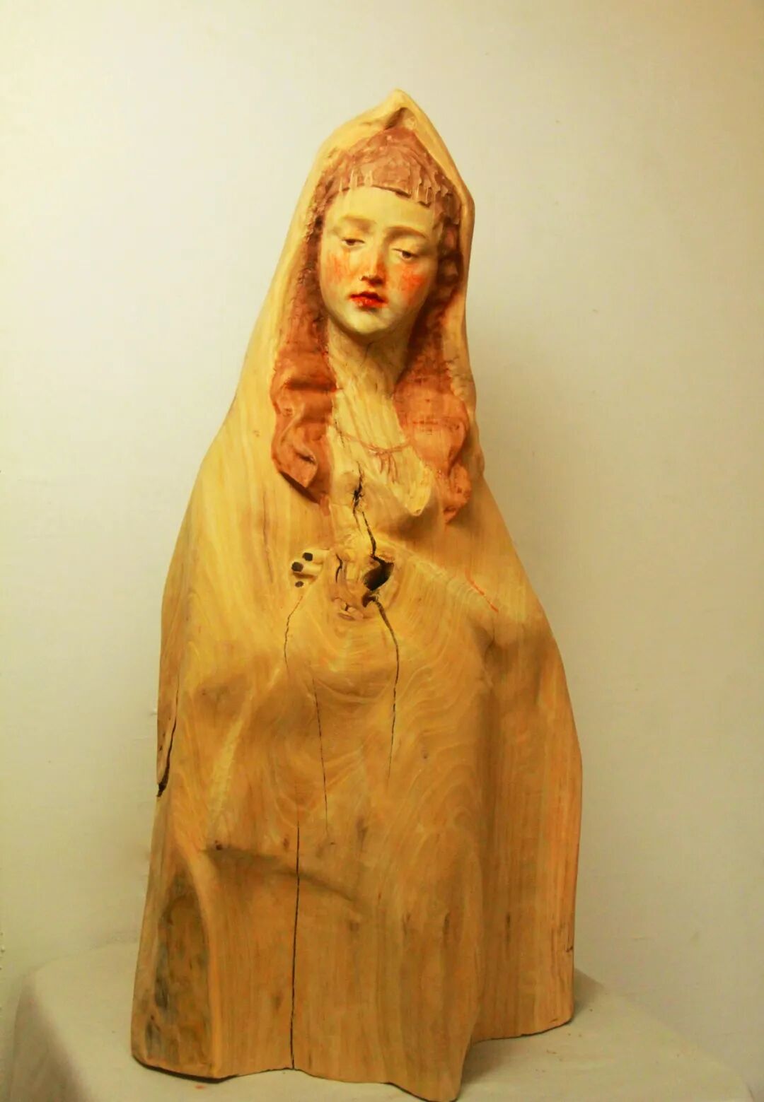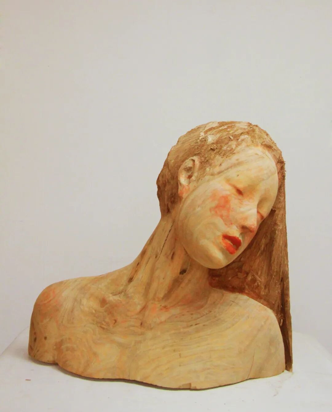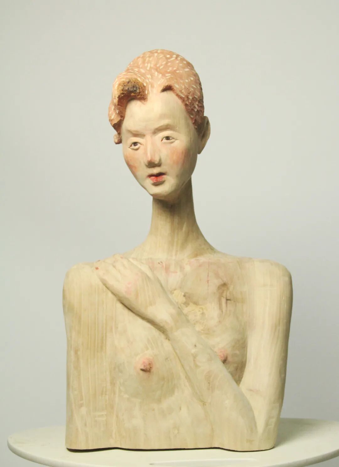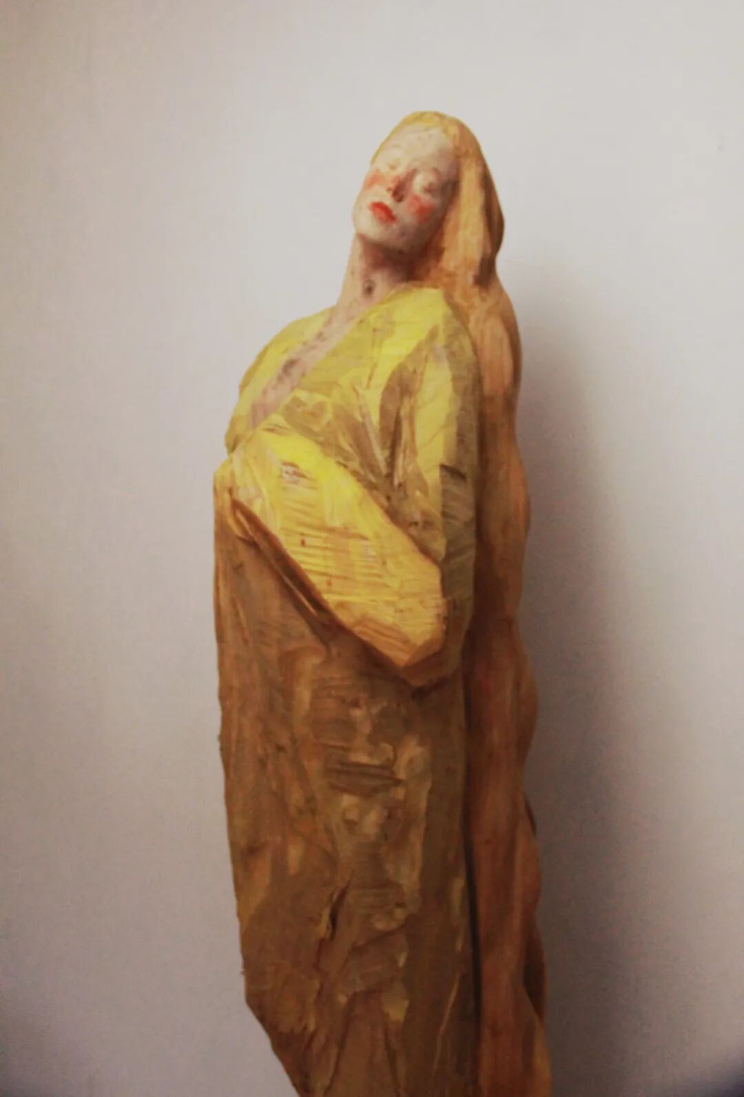 徐长远的雕刻作品能够达到这种效果不仅是因为他对人物形象和情绪有着精准的把控,还因为他对色彩巧妙的选择与使用。在《祈祷》《修行》系列作品中,徐长远很大程度上保留了木头本身的颜色,只选取部分上色。上色位置多是头发、五官、配饰与衣物。人体的皮肤几乎都保留木头的本色和纹理,只有在五官用少许的颜色勾勒。这些选择性的上色突出了人物的性格和情绪,让徐长远的雕刻作品更加传神。