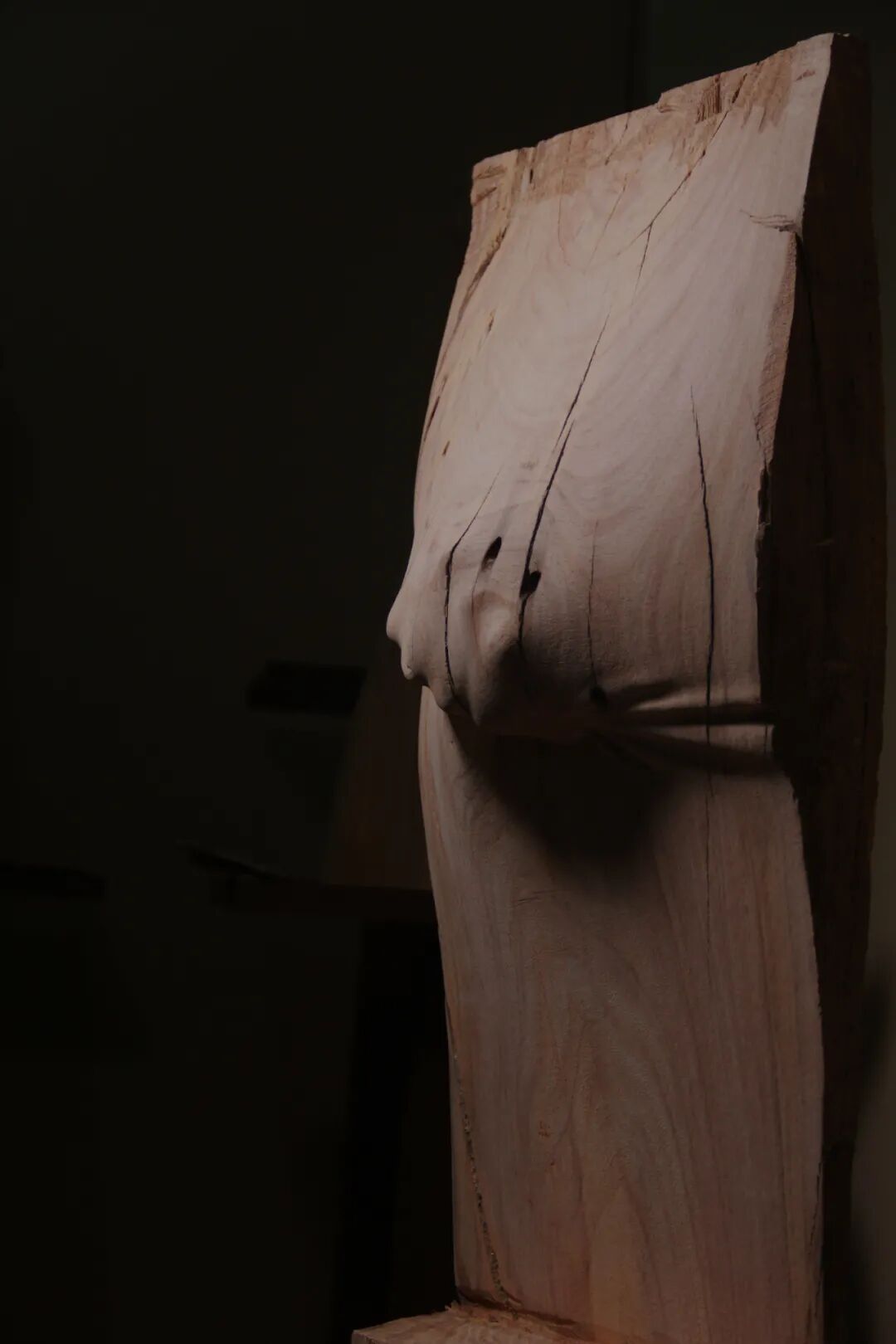 不仅是人物面部、身体的线条以及内心的情绪,木头原本的颜色和质感也是艺术家展现给观者的作品中的关键部分。在用他的刻刀、锤子、砂纸等工具把一块木头一点一点地删减直到人物形象诞生的过程中,徐长远也展现出木头作为一种创作材料本身的美丽。木头的质感虽然明显的展现给观者这些人物形象作为木雕作品的本质,但它温厚的属性和颜色拉近了观者和作品之间的距离。这些木头做的人没有给观者一种“生人勿进”的距离感,而是用它们的“温度”吸引着观者的目光与内心。木头与生俱来的美丽与徐长远创作的人物相辅相成,而徐长远所做的不仅是把木头雕刻出人的形象,也是赋予木头人的灵魂。