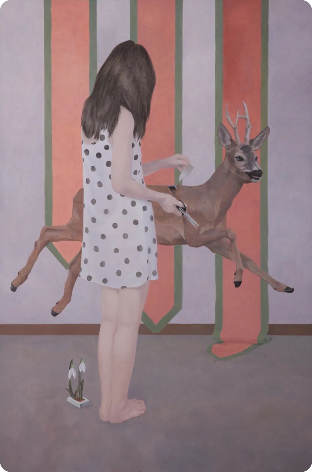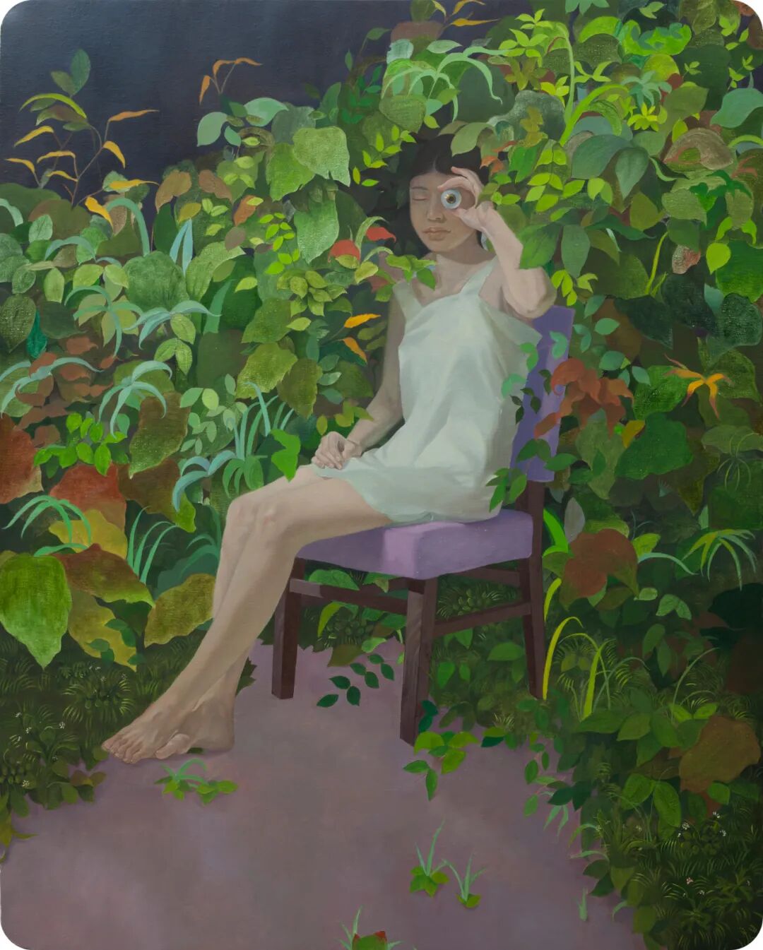 赤足的少女、清晨的树林、斑点连衣裙、安静苍劲的树枝、野蛮生长的树干都是些死于时光荏苒的尸骨,它们被时间的车轮碾过,被易逝的青春淹没,而当棱角变成了规矩,甜蜜衍生出痛苦,艺术家开始回头眺望它们,俯身拾掇它们,这是记忆的收集。它们如同破碎的镜子一般被一片片拾起,一点点粘合,最后倒映出最开始的时光中残存的影子来。