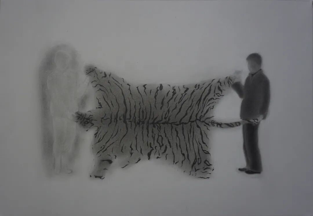 解读是自我的状态的投射,是尔后衍生的创造。“大家本来是两个各自独立的系统。”创造是一个排开的过程,也是一个包容的过程,我们的成分和作者的成分如主宾在宴席上觥筹交错。王明之画中的成分,总是具体的物事,人、草坡、山、狒狒、云、老虎、黑板、狗、石像、马、果实、骨、大海,是我们熟悉的日常所有,让我们觉着好亲切。