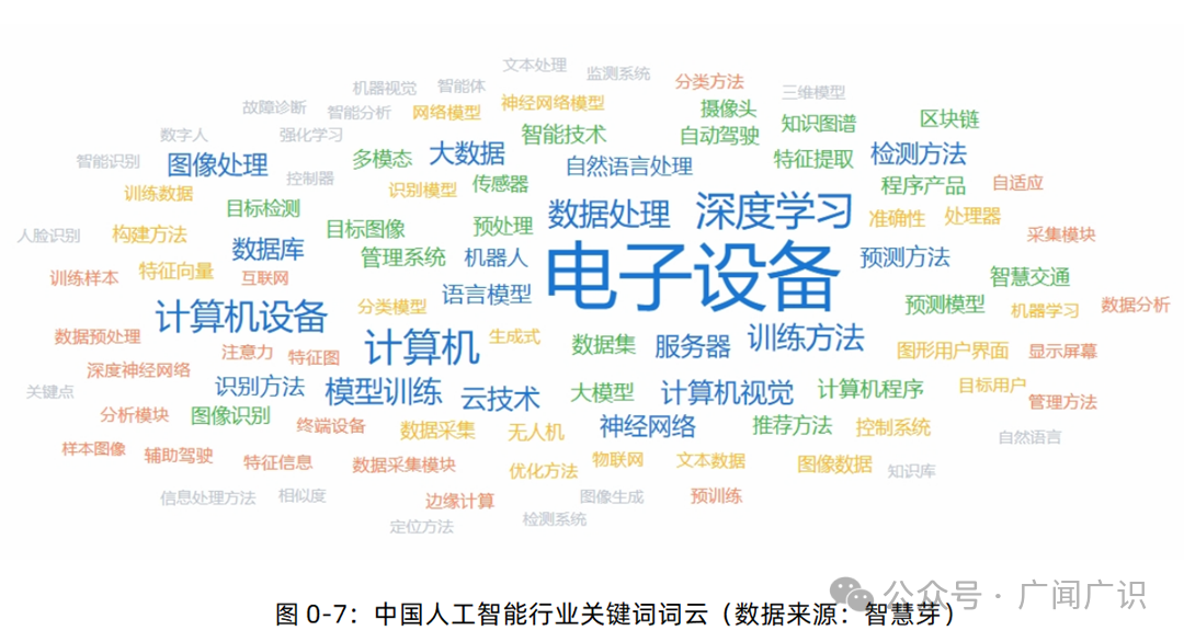 中国人工智能行业相关专利中提及最多的关键词是电子设备,其次是深度学习、计算机、计算机设备、数据处理、模型训练、云技术、大数据、图像处理、神经网络等等。