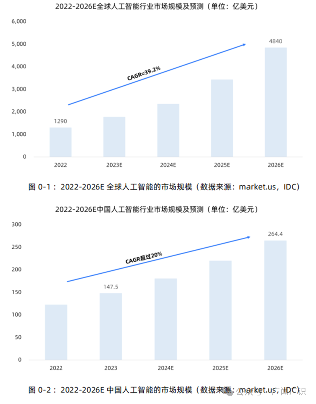 近年来,随着计算机技术的不断进步和应用领域的扩大,全球人工智能市场正在快速发展。据估算,到 2022 年,全球该市场规模已达 1290 亿美元。受疫情、地缘政治及宏观经济等因素的影响,2023 年中国市场规模增长不及预期,预计 2023 年增至 147.5 亿美元,约占全球总规模十分之一。2026 年中国 AI 市场将实现 264.4 亿美元市场规模,2021-2026 五年复合增长率(CAGR)将超 20%。