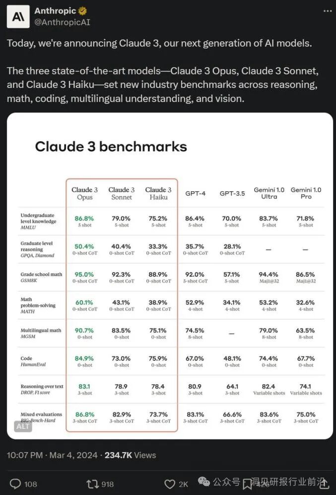 这一新版本的旗舰模型Opus,在本科及研究生层次的知识掌握、数学问题解决以及复杂任务理解等多个方面,均实现了对OpenAI的GPT-4和谷歌的Gemini 1.0 Ultra的超越,标志着AI技术的又一重大飞跃!