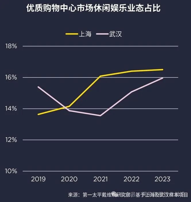 体现在商场中,购物中心内休闲娱乐业态整体占比也在2023年持续提升。在上海,休闲娱乐类业态占比由2019年的13.6%增长至16.5%,而武汉休闲娱乐业态占比在过去三年内也显著回升,并超过疫情前水平达到16.0%。
