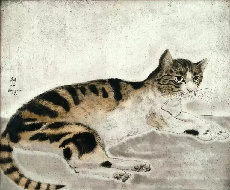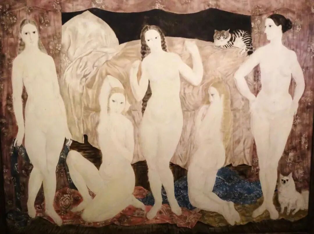 或出于岛国的血统,藤田中年的作品有浓烈的儒子气质。《欧洲人日本渡来之图》是中年时期的代表作,金箔底子上数十人茕茕孑立。时值战前,巴黎画派的繁盛时期,夏加尔、苏丁、莫迪里阿尼都是藤田的好友,每日的社交活动频繁有趣。出席活动之余,藤田就在画室里创作。这个时期他结交了不少模特,虽然困苦,但是藤田和她们相处的很融洽。