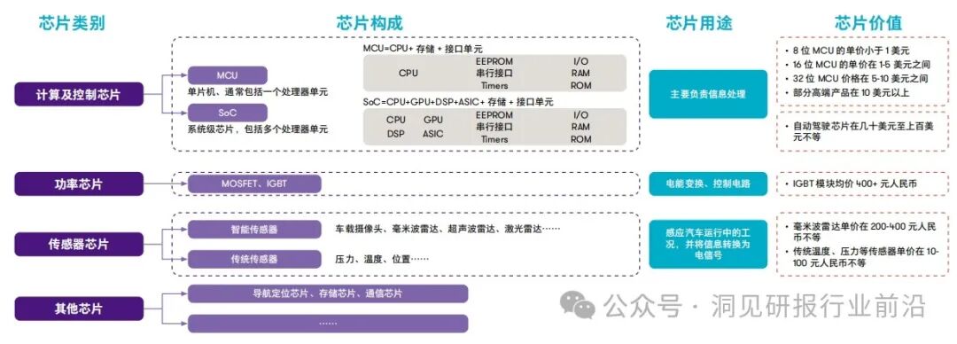 根据功能划分,车规级芯片主要分为四类:计算及控制芯片、功率芯片、传感器芯片及其他芯片。相较于消费级、工业级芯片,具有高可靠性、高安全性、高稳定性特点,要求零缺陷且可长期供货(一般10-15年供货周期),并且达到AEC规范要求的车规级芯片。