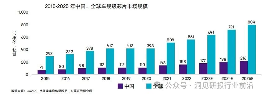 车规级芯片市场规模提升,主要得益于新能源汽车市场渗透率提高推动车规芯片汽车总需求量增长,且汽车智能化推动单车芯片需求数量增长。2022年全球车规级芯片市场规模561亿美元,相较2021年同比增长10.4%。