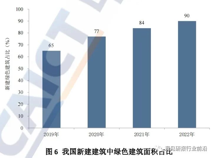 我国建筑节能与绿色建筑规模快速发展。2022年全国新建绿色建筑面积20多亿平方米,新建绿色建筑面积占比超过90%,获得绿色建筑标识项目累计达2.5万个。可再生能源在建筑领域的应用规模持续扩大,太阳能光伏装机容量不断提升。