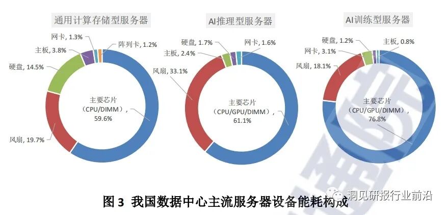 服务器、存储等设备中的各类芯片用能占设备能耗的主要部分,此外,风扇也是耗能较多的部件。2022年对国内服务器设备厂商的调研显示,在主流通用计算存储型服务器中处理器(CPU)、DIMM内存等主要芯片能耗占服务器设备总能耗近60%,风扇、硬盘分别占约20%和15%左右:在主流AI推理型服务器中,处理器(CPU/GPU)、DIMM内存等主要芯片能耗占服务器设备总能耗的61%,风扇能耗高达33%;在主流AI训练型服务器中,处理器(CPU/GPU)DIMMM内存等主要芯片能耗占服务器设备总能耗的比重超过75%,此外风扇能耗占比18%左右。