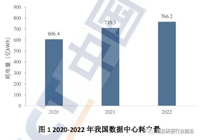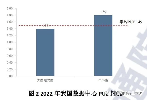 数据中心绿色技术加速涌现,液冷、蓄冷、高压直流、余热利用、蓄能电站等技术的应用,以及太阳能、风能等可再生能源利用,进一步降低了数据中心能耗及碳排放。截至2022年底,我国在用数据中心机架规模达到650万标准机架。据测算,2022年,我国数据中心总耗电量达到766亿kWh,占全社会耗电量(86372亿kWh)的0.9%,2022年,我国数据中心平均电能利用效率(PUE)为1.49,其中大型超大型数据中心平均PUE为1.39,中小型数据中心平均PUE为1.80,与2019年相比能效进一步优化。我国数据中心平均水利用效率(WUE)为1.47。
