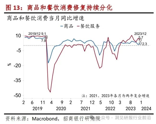 2023年,我国消费在低基数下实现较高增长,但修复动能仍然偏弱。全年社会消费品零售总额同比增长7.2%,两年复合增速3.4%,低基数下同比增速大幅转正,修复动能略低于2021 年。