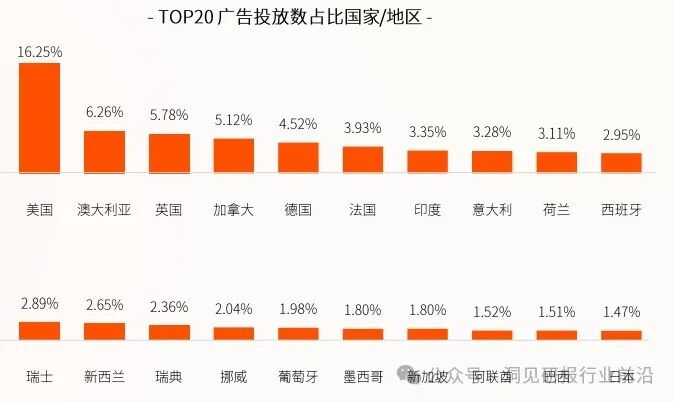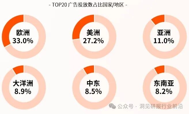 在全球广告投放分布上,欧美市场的占比达到六成以上。由于这些市场的竞争激烈,卖家们也不得不投入更多来维持和提升市场份额。相比之下,诸如印度、新加坡、巴西等新兴市场在今年的投放量也能排进全球前20,尽管份额不高,但增速较快。