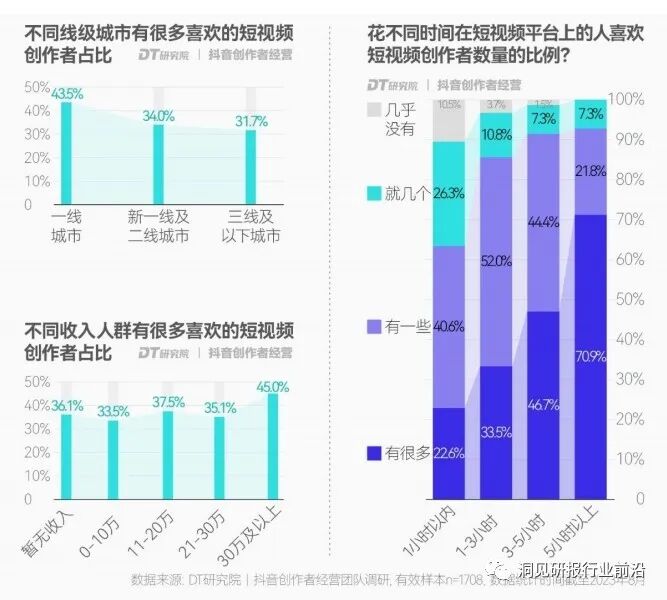 除去年龄,按照其他划分标准来看,收入、城市和短视频平台使用时长,都会影响人们对创作者的博爱程度。