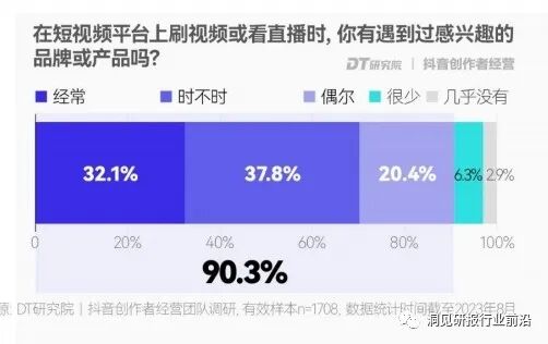 超9成的短视频平台用户,在刷视频或看直播时有遇到过感兴趣的品牌或产品,近1/3遇到感兴趣的频率是“经常”。